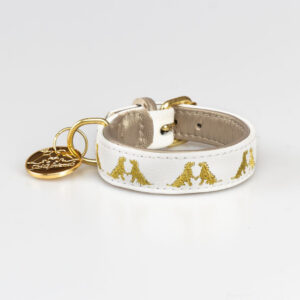 Collare ricamato in pelle bicolore con bordo. Minuteria metallica in ottone galvanica nickel free. Ogni collare è unico, realizzato dai nostri artigiani su misura.  Al momento dell’ordine, sarai contattato per poter prendere le misure insieme alle nostre designer.